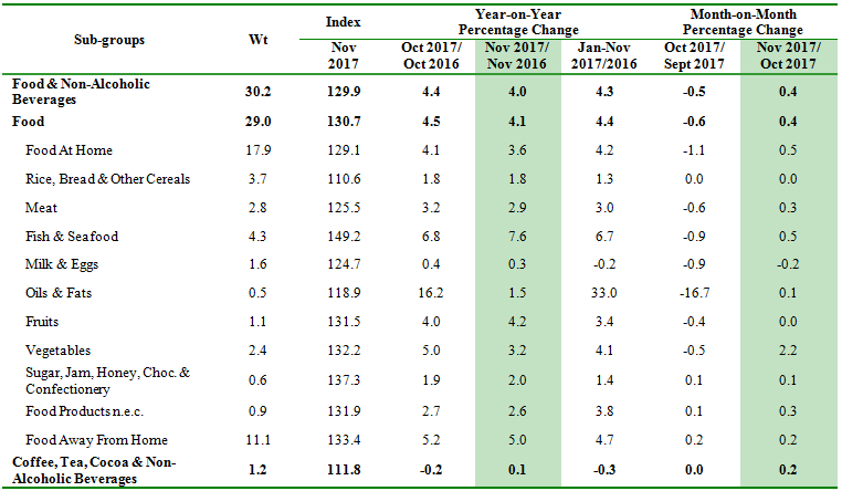 On a monthly basis, the index for Food & Non-Alcoholic Beverages increased 0.4 per cent to 129.9 in November 2017. Meanwhile, the index for Non-Food increased 0.8 per cent in November 2017 compared with the preceding month.