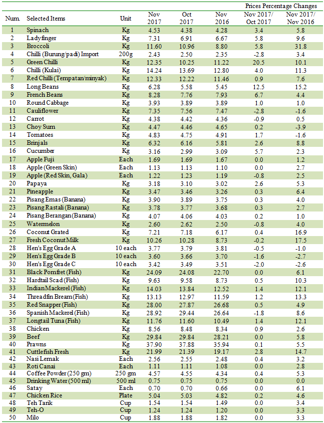 Among the index of food items which recorded notable increases in November 2017 as compared to the same period of last year were Cuttlefish (+13.5 per cent), Long Beans (+13.4 per cent), Indian Mackerel (Fish)(+10.3 per cent), Spinach (+8.4 per cent), Choy Sum (+6.9 per cent), Hardtail Scad (Fish) (+5.9 per cent), Chicken (+3.9 per cent), Prawn (+3.3 per cent) and Spanish Mackerel (Fish) (+3.2 per cent). Meanwhile, decreases were registered in the index of some food items such as Carrots (-3.6 per cent), Watermelon (-1.1 per cent) and Hen's Eggs (-0.6 per cent).