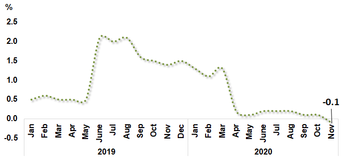 The CPI without fuel fell 0.1 per cent in November 2020 as compared to November 2019. CPI without fuel covers all goods and services except Unleaded Petrol RON95, Unleaded Petrol RON97 and Diesel.