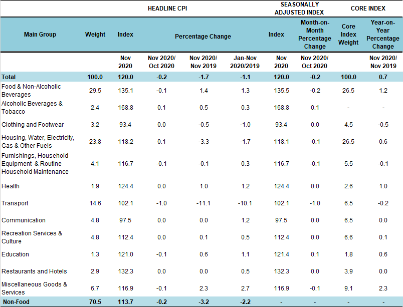 Core index rose 0.7 per cent in November 2020 as compared to the same month of the previous year. Among the major groups which influenced the increase were Miscellaneous Goods & Services (2.3%), Food & Non-Alcoholic Beverages (1.2%), Health (1.0%), Housing, Water, Electricity, Gas & Other Fuels (0.6%) and Education (0.6%).