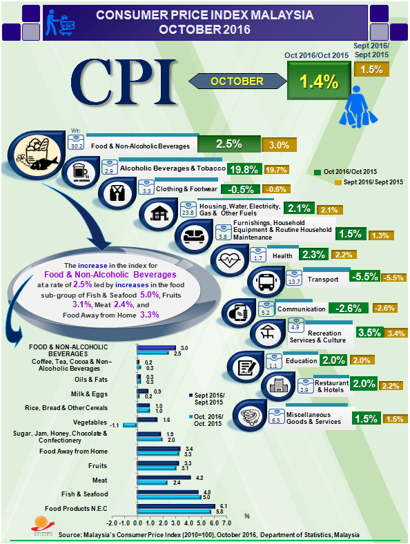 The index for Food & Non-Alcoholic Beverages increased 2.5 per cent in October 2016. The increase was fuelled by the food sub-group which encapsulated of Fish & Seafood (+5.0 per cent); Fruits (+3.1 per cent) and Meat (+2.4 per cent). As for Food Away From Home index, it continued to rise in October 2016, showed an increase of 3.3 per cent.