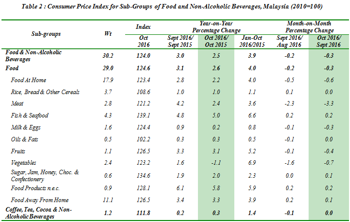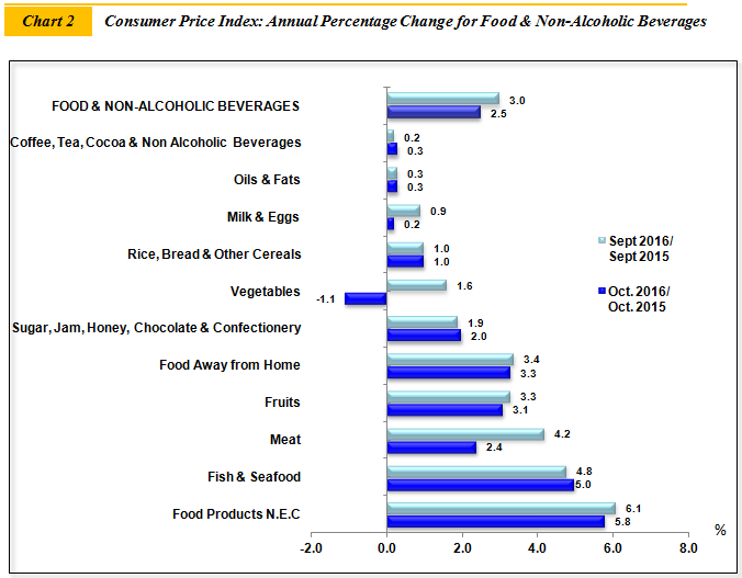 The index for Food & Non-Alcoholic Beverages were the main upward contributor to the CPI rise in the period January – October 2016, registered an increase of 3.9 per cent. The increase was the result of increases in the index for Food At Home (+4.0 per cent); Food Away From Home (+3.9 per cent) and Coffee, Tea, Cocoa & Non-Alcoholic Beverages (+1.4 per cent). Among the subgroups of Food At Home which showed significant increases during this period as shown in Table 2 were Vegetables (+6.9 per cent); Fish & Seafood (+6.6 per cent); Fruits (+5.2 per cent) and Meat (+3.6 per cent).