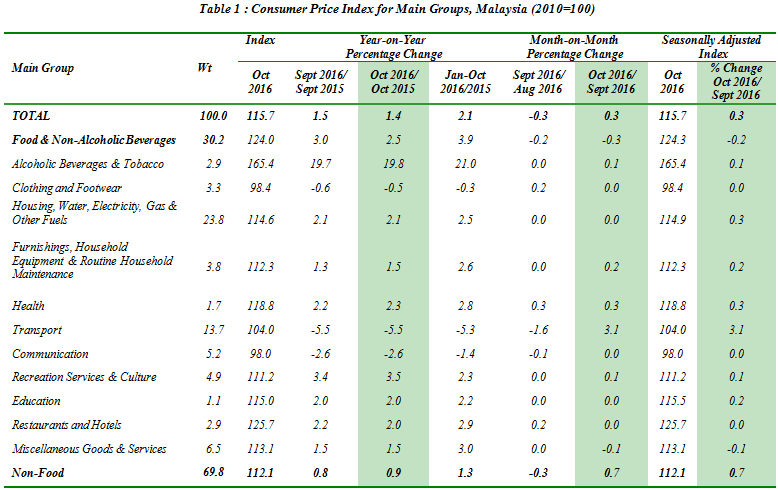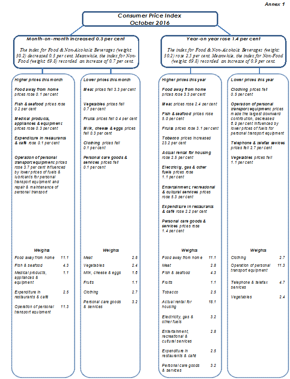 The overall index for CPI in October 2016 rose 1.4 per cent to 115.7 from 114.1 in the corresponding month of the preceding year. The increase in the indices for Food & Non-Alcoholic Beverages (+2.5 per cent ) and Housing, Water, Electricity, Gas & Other Fuels (+2.1 per cent) were offset by the decrease in the indices of Transport group by 5.5 per cent; Communication (-2.6 per cent) and Clothing & Footwear (-0.5 per cent) (Table 1).