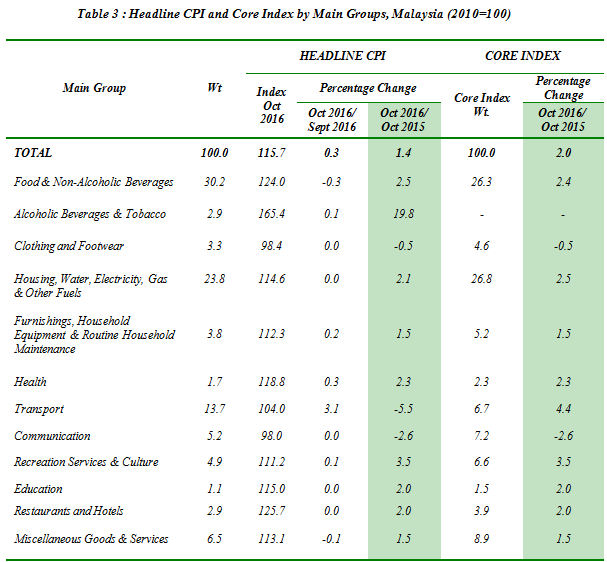 Consumer Price Index Malaysia September 2016 21 September 2016