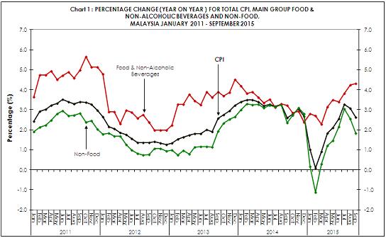 Overall, the index for Food & Non-Alcoholic Beverages (weight: 30.3) rose 4.3 per cent on a year-on-year basis in September 2015. Meanwhile, the index for Non-Food (weight: 69.7) recorded an increase of 1.8 per cent (Chart 1 and Table 1).