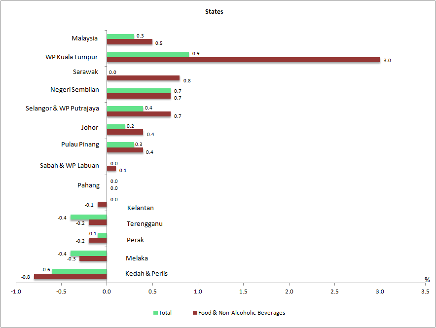 In terms of overall CPI, three states surpassed the national CPI rate of 0.3 per cent recorded in September 2018 as compared to September 2017. The states were Wilayah Persekutuan Kuala Lumpur (+0.9 per cent), Negeri Sembilan (+0.7 per cent) and Selangor & Wilayah Persekutuan Putrajaya (+0.4 per cent). Meanwhile, Pulau Pinang showed the same rate as the national CPI.