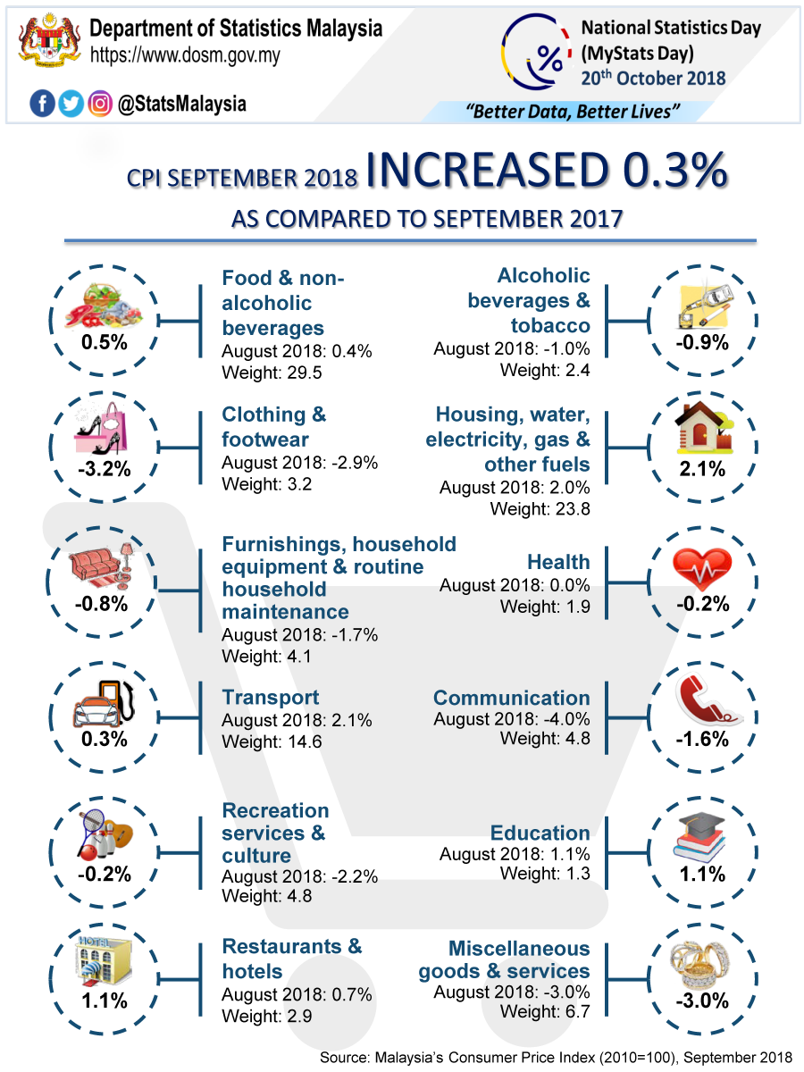 The Consumer Price Index (CPI) grew at a slower pace of 0.3 per cent in September 2018 due to the impact of RON95 fuel prices which remained at RM2.20 from March 2018 to September 2018 as compared to the same period in 2017. Although Sales & Service Tax (SST ) was re-instated beginning September 1, 2018, in terms of the index, it did not show significant change as compared to a year ago.