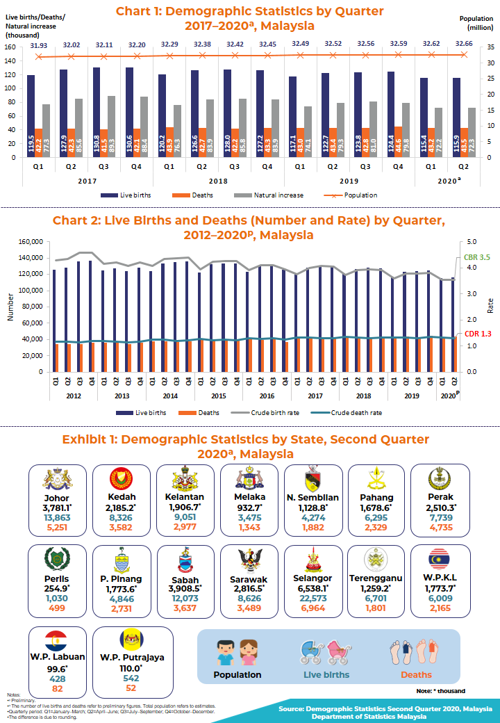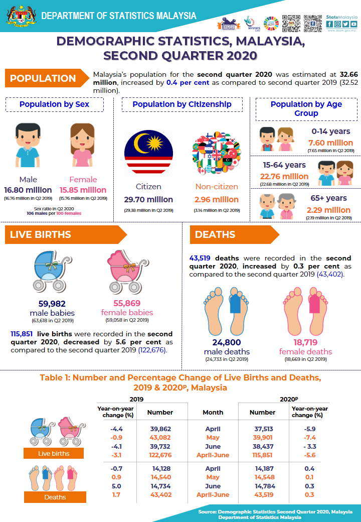 The full publication of the Demographic Statistics, Malaysia Second Quarter 2020, can be downloaded through eStatistik Portal.
