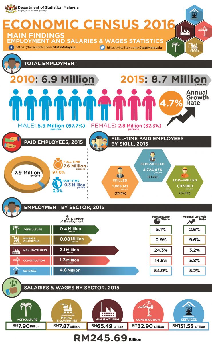 In 2015, there were 8.7 million persons working in the formal private sector as compared to 6.9 million persons in 2010. Out of this total, 67.7 per cent (5.9 million persons) were male while 32.3 per cent (2.8 million persons) were female. The paid employees category represented 90.4 per cent of the entire employees in 2015. Most of the paid employees were full-time employees (97.0%) while the remaining (3.0%) were part time employees. In terms of number of employment by skill, semi-skilled workers dominated with a share of 61.9 per cent followed by skilled workers (23.5%) and low-skilled (14.6%). From the perspective of economic activity, the Services sector recorded the highest number of employment, which was 4.8 million persons (54.9%) and followed by the Manufacturing sector with 2.1 million persons (24.3%). Meanwhile, Construction and Agriculture sector recorded 1.3 million persons (14.8%) and 0.4 million persons (5.1%) respectively. The Mining & Quarrying sector recorded the lowest percentage share of 0.9 per cent with 0.08 million persons in 2015.