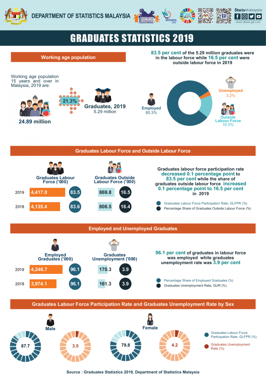 Out of total graduates in the labour force, 96.1 per cent (4.25 million persons) were employed, increased 6.9 per cent from 3.97 million persons in 2018. Meanwhile, graduates unemployment rate remained at 3.9 per cent (170.3 thousand persons). In addition, graduates outside labour force rose 7.6 per cent to 871.4 thousand persons (2018: 808.5 thousand persons).