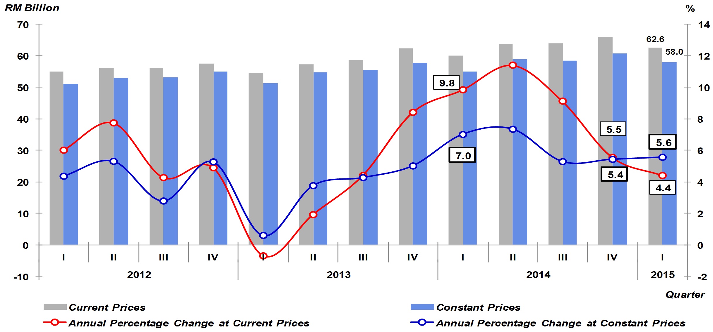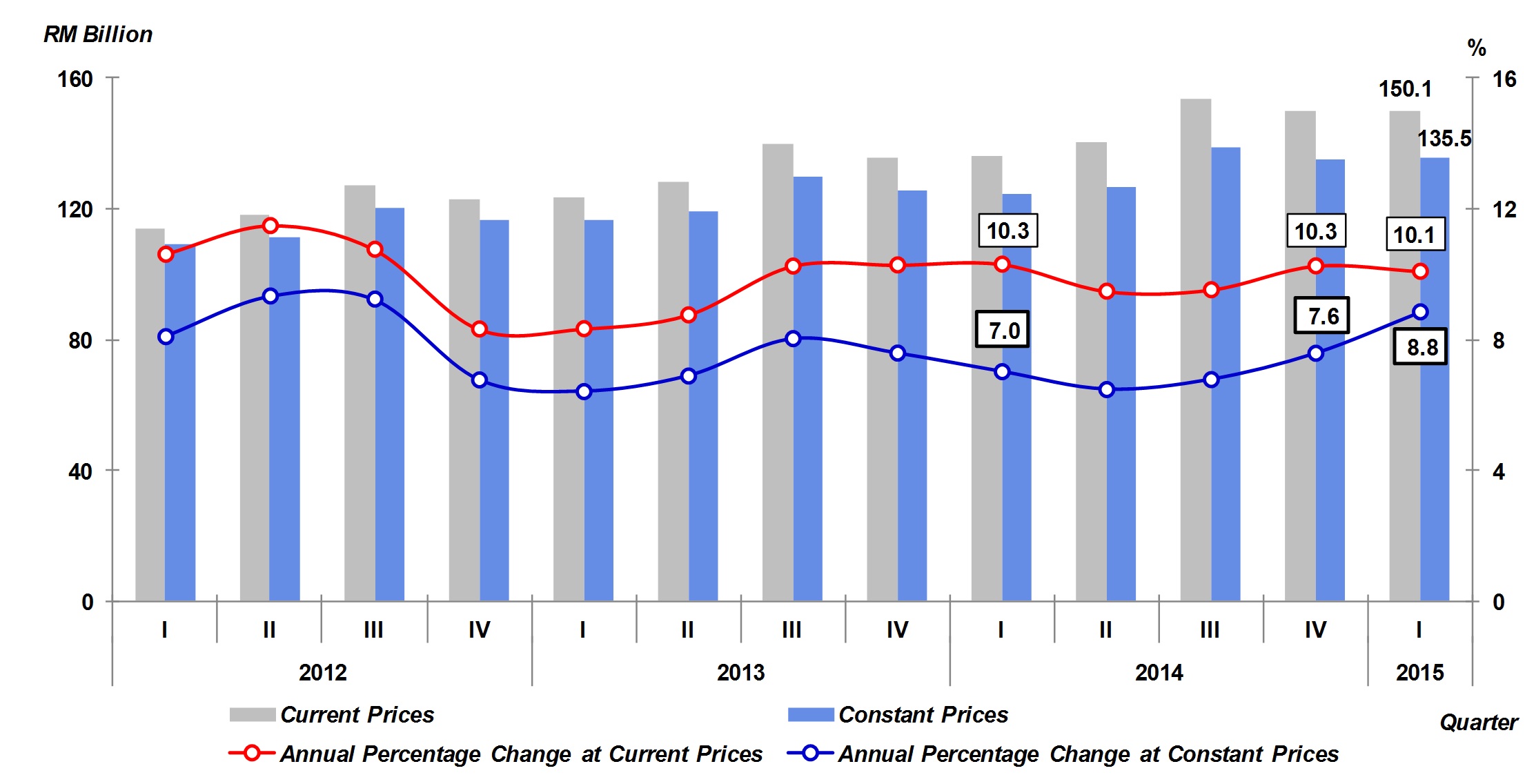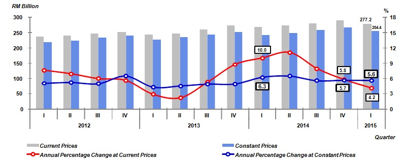 Malaysia’s economy remained resilient in first quarter of 2015 by registering a growth of 5.6 per cent. GDP in current prices amounted to RM277.2 billion in this quarter. In constant 2010 prices, GDP registered a value of RM254.4 billion.