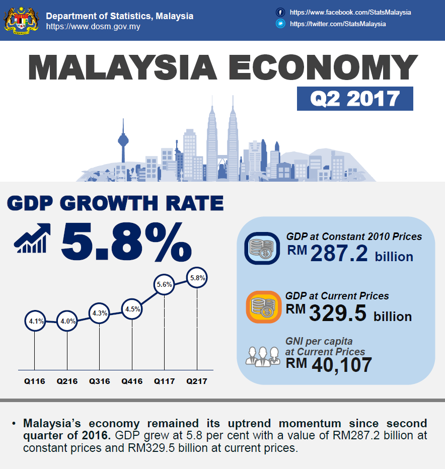 Malaysia’s economy remained its uptrend momentum since second quarter of 2016. In this quarter, GDP registered a growth of 5.8 per cent as compared to 5.6 per cent in the previous quarter. On a quarter-on-quarter seasonally adjusted, GDP posted a growth of 1.3 per cent against 1.8 per cent in the preceding quarter.