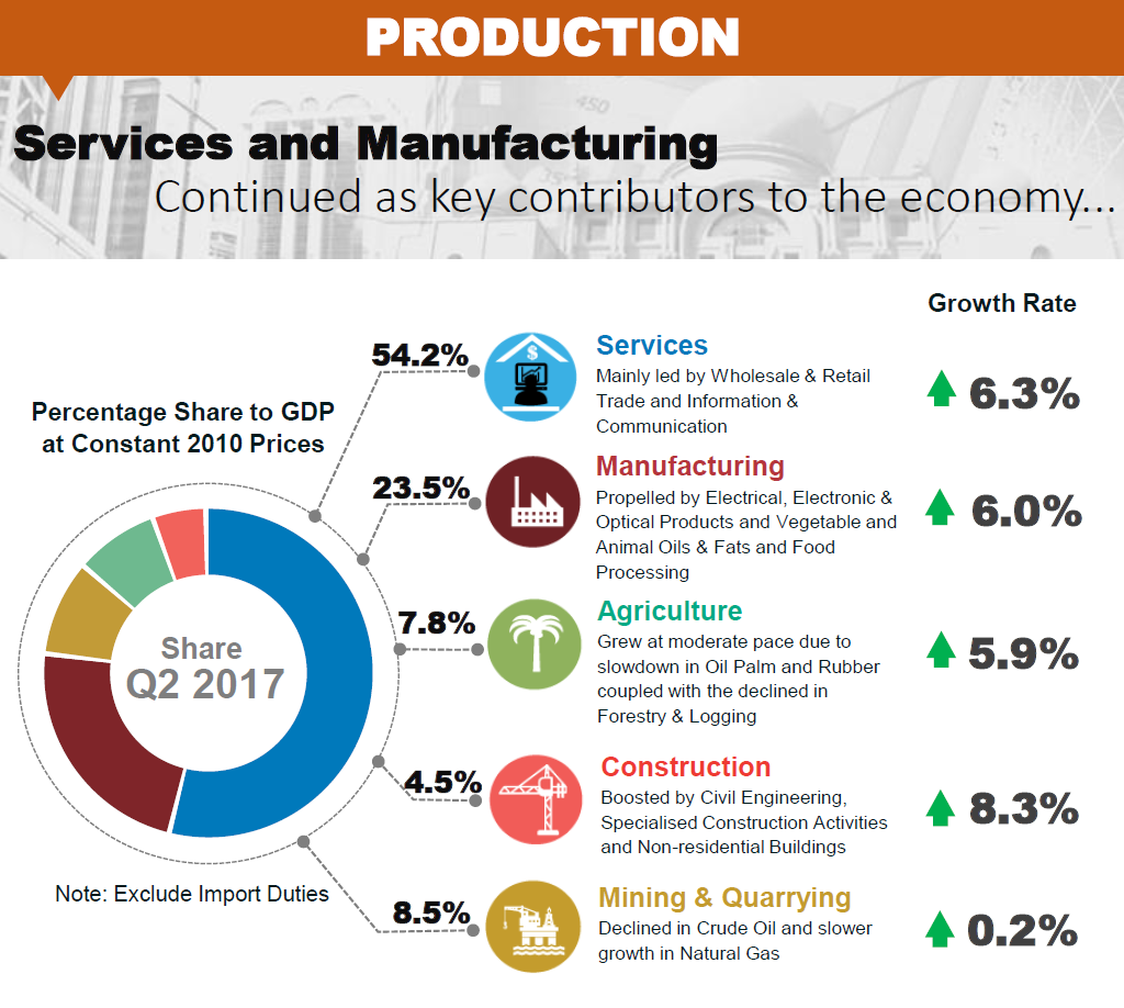 Manufacturing sector increased further to 6.0 per cent from 5.6 per cent in the first quarter of 2017. Electrical, Electronic & Optical products was the main impetus for this sector with a growth of 9.8 per cent, supported by higher production of semiconductors and consumer electronics. Furthermore, Vegetable and Animal Oils & Fats and Food Processing accelerated to 10.4 per cent led by refined palm oil products.