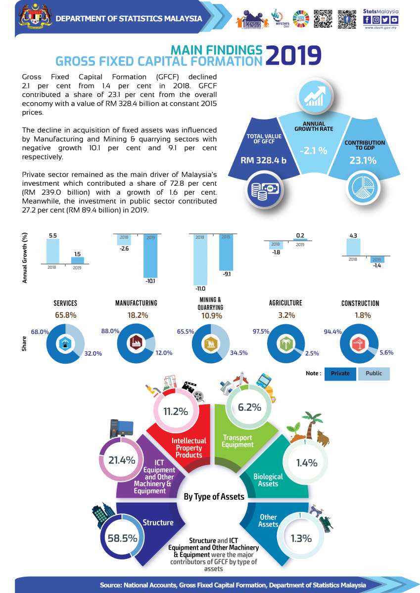 In 2019, Malaysia’s Gross Fixed Capital Formation (GFCF) at current prices recorded RM346.8 billion with a decrease of RM3.5 billion in year 2018 and GFCF at constant prices amounted to RM328.4 billion (Chart 1). GFCF posted a negative growth of 2.1 per cent from 1.4 per cent in the preceding year due to lower acquisition of fixed assets in Manufacturing and Mining & quarrying sectors. GFCF is the second largest component in GDP with a share of 23.1 per cent (2018: 24.6%) from the overall economy as shown in Chart 2.