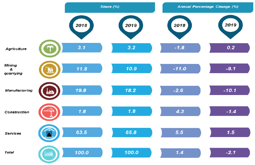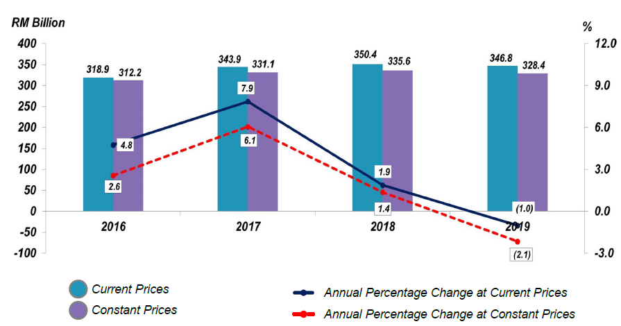 In 2019, Mining and quarrying sector improved to negative 9.1 per cent from a negative growth of 11.0 per cent in the preceding year. Construction sector decreased 1.4 per cent as compared to 4.3 per cent in 2018. Meanwhile, Agriculture sector posted a growth of 0.2 per cent (2018: -1.8%) due to a positive growth in Livestock & fishing 5.3 per cent (2018: 6.7%).