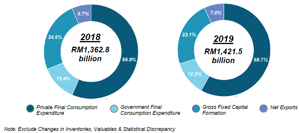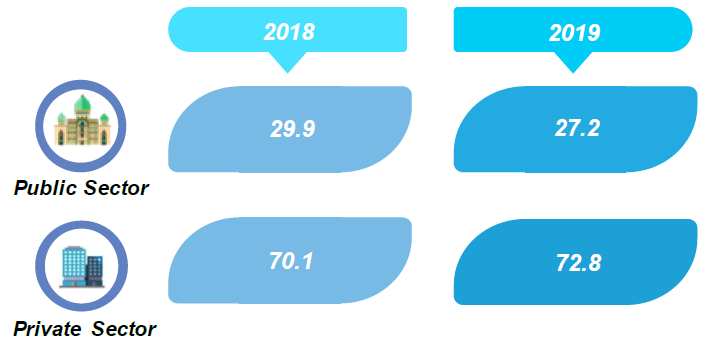 Private sector which contributed 72.8 per cent was the main impetus for Malaysia’s investment with a growth of 1.6 per cent (2018: 4.3%). However, Public sector recorded a smaller portion by contributing 27.2 per cent in 2019 as illustrated in Exhibit 2.