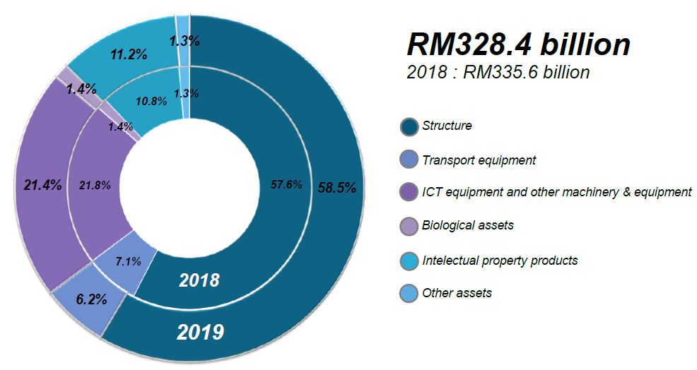 Structure remained as the major contributor to GFCF by type of assets with a share of 58.5 per cent and declined 0.6 per cent (2018: 1.9%). The acquisition of fixed assets in ICT equipment and other machinery & equipment and Other assets declined 4.0 per cent (2018: -2.7%) and 5.4 per cent (2018: 6.2%) respectively.