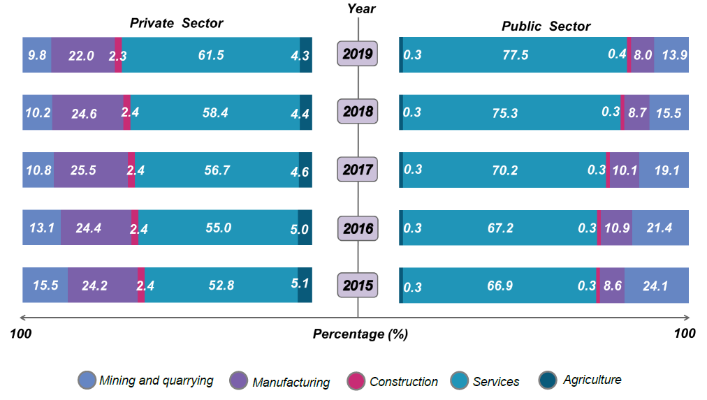 GFCF of Public sector was largely dominated by Services and Mining & quarrying activities with a share of 77.5 per cent and 13.9 per cent respectively. Meanwhile, Manufacturing activity registered a share of 8.0 per cent as against 8.7 per cent in 2018.