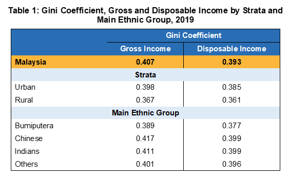 The Gini coefficient can also be measured based on disposable income where in 2019 it grew by 0.2 percentage points from 0.391 (2016) to 0.393 (2019). Over the period, Gini coefficient in urban area increased from 0.380 to 0.385 while Gini coefficient in rural decreased from 0.365 to 0.361. The Gini coefficient for the Bumiputera reduced from 0.380 to 0.377 while for the Chinese it has climbed up from 0.396 to 0.399. The Gini coefficient for the Indians also recorded a rise from 0.372 to 0.399.