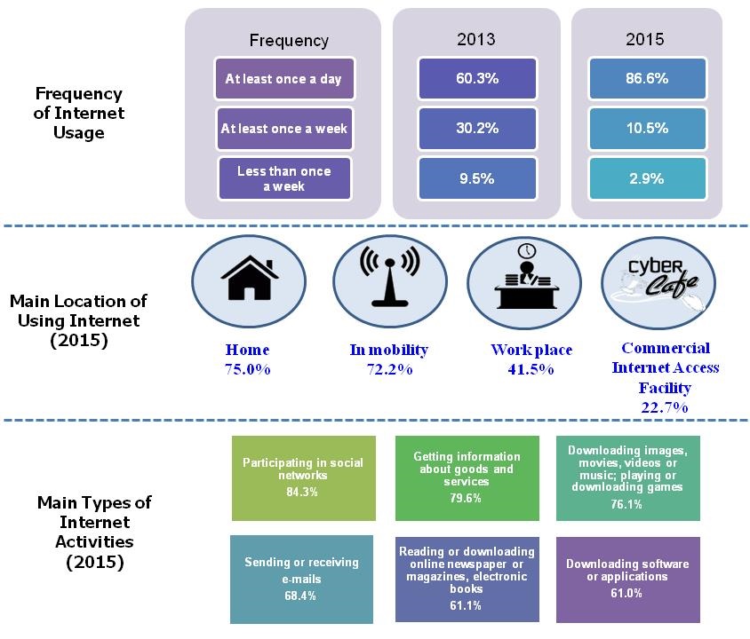 Percentage of individuals using Internet at least once a day in 2015 was 86.6 per cent which increased by 26.3 percentage points compared to 60.3 per cent in 2013. Among the Internet users, three main locations of Internet usage in 2015 were at home (75.0%), in mobility (72.2%) and at work place (41.5%).