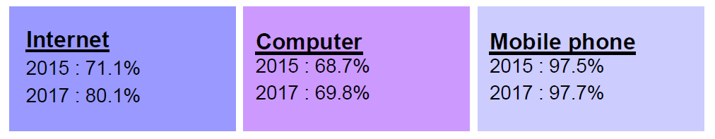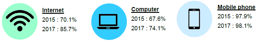 Percentage of households access to Internet increased 15.6 percentage points to 85.7 per cent in 2017 compared to 70.1 per cent in 2015. Households access to computer also increased 6.5 percentage points from 67.6 per cent in 2015 to 74.1 per cent in 2017. Percentage of households access to mobile phone also increased 0.2 percentage points to 98.1 per cent in 2017 as compared to 97.9 per cent in 2015.