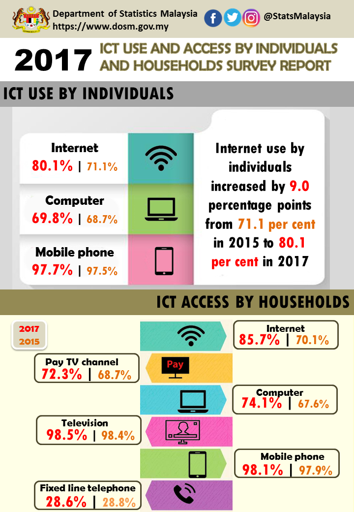 In 2017, percentage of individuals in Malaysia aged 15 years and above using Internet was 80.1 per cent, increased by 9.0 percentage points compared to 71.1 per cent in 2015. Percentage of individuals using computer also increased 1.1 percentage points from 68.7 per cent in 2015 to 69.8 per cent in 2017. Meanwhile, 97.7 per cent of individuals were using mobile phones in 2017 compared to 97.5 per cent in 2015.