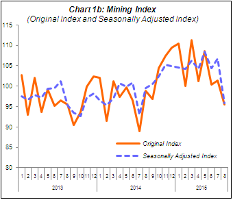 PERFORMANCE OF MINING SECTOR The Mining sector output decreased 3.4% in August 2015 as compared to the same month in 2014 due to the declined in Natural Gas index (11.8%), whilst, the Crude Oil index grew by 4.4%. On a seasonally adjusted terms, output for the Mining sector fell by 10.2% as compared to July 2015. |