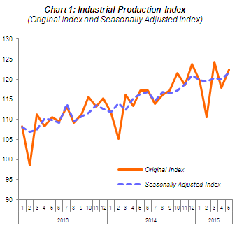 PERFORMANCE OF INDUSTRIAL PRODUCTION INDEX The Industrial Production Index (IPI) increased by 4.5% in May 2015 as compared to the same month in the previous year. The rise in May 2015 was supported by the positive growth in all indices: Manufacturing (3.2%), Mining (9.0%) and Electricity (1.2%). The IPI in April 2015 remained unchanged by 4.0% year-on-year. In seasonally adjusted terms, the IPI in May 2015 rose 1.5% month-on-month due to the increase in Manufacturing (0.4%) and Mining (4.0%) indices. Meanwhile, Electricity index fell by 1.3%. |