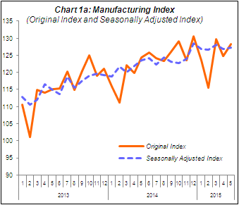 PERFORMANCE OF MANUFACTURING SECTOR Year-on-year, Manufacturing output posted a slower growth of 3.2% in May 2015 as compared to 4.2% registered in April 2015. The major sub-sectors which increased in May 2015 were: Petroleum, Chemical, Rubber and Plastic Products (3.8%); Electrical and Electronics Products (4.0%); and Non-metallic Mineral Products, Basic Metal and Fabricated Metal Products (2.8%). On a seasonally adjusted month-on-month basis, Manufacturing output grew marginally by 0.4% in May 2015. |