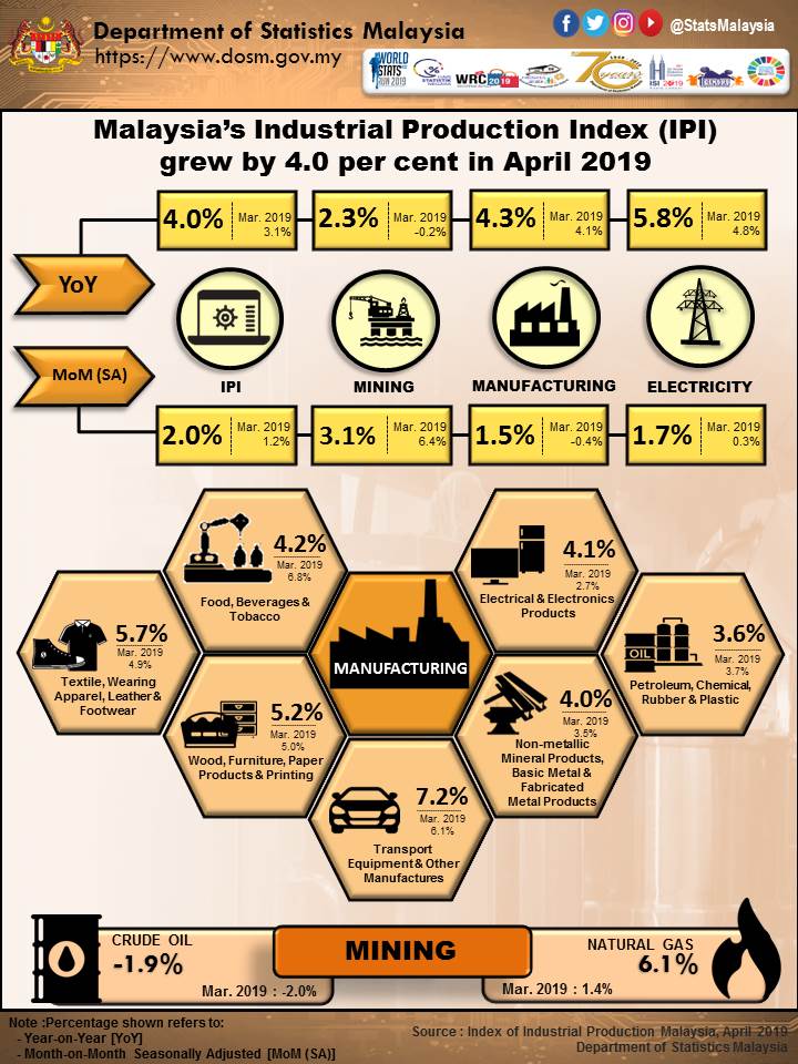Malaysia’s Industrial Production Index (IPI) grew by 4.0 per cent in April 2019