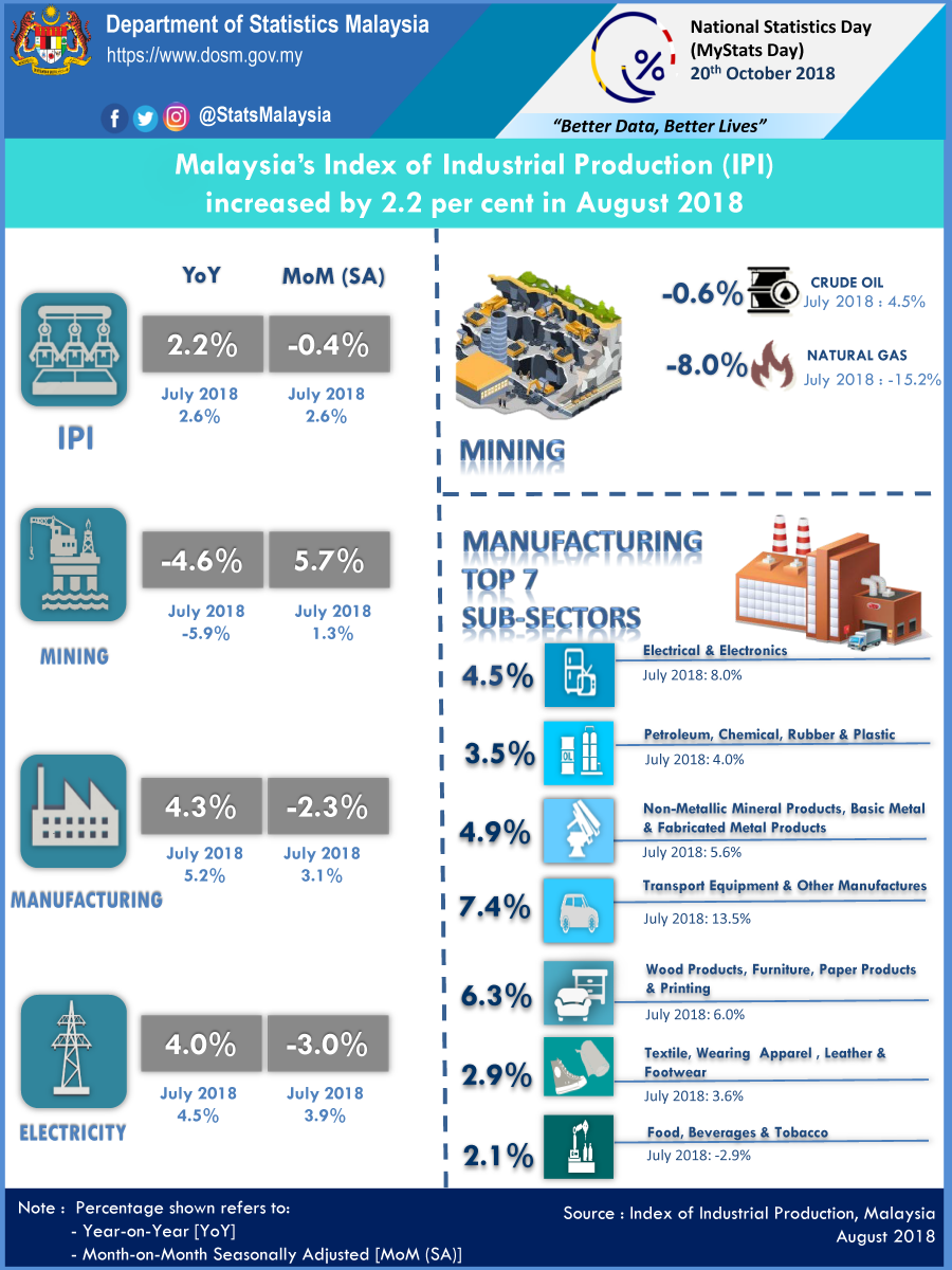 Malaysia’s Industrial Production Index (IPI) increased by 2.2 per cent in August 2018