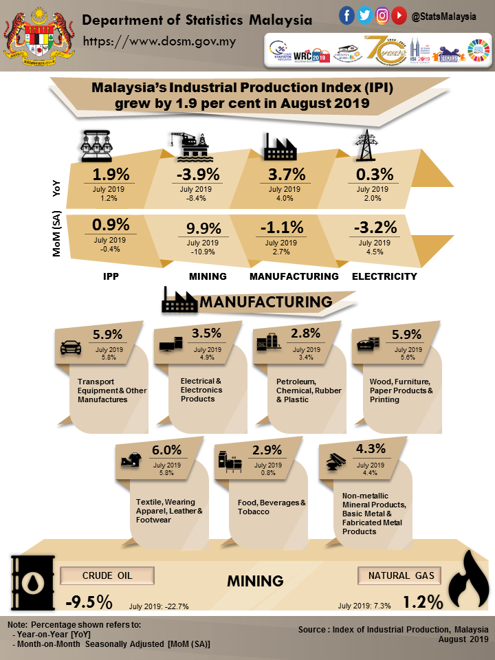 Malaysia’s Industrial Production Index (IPI) grew by 1.9 per cent in August 2019