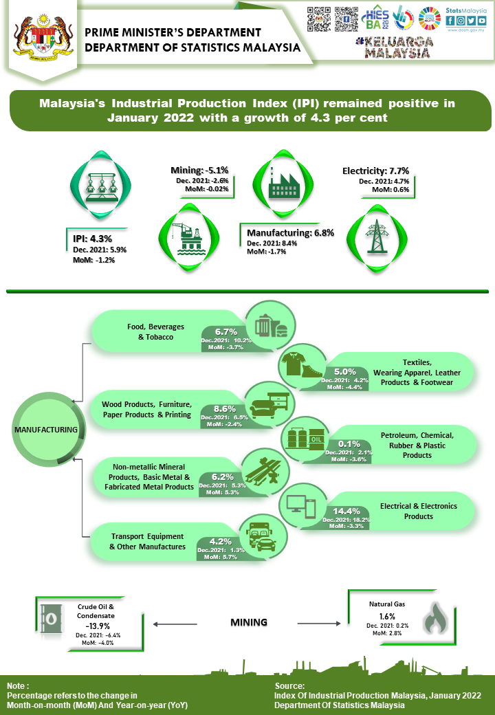 Malaysia's Industrial Production Index (IPI) remained positive in January 2022 with a growth of 4.3 per cent
