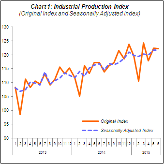The Industrial Production Index (IPI) increased by 4.3% in June 2015 as compared to the same month of the previous year. The expansion in June 2015 was supported by positive growth in Manufacturing  (4.9%) and Mining (4.0%). However, the Electricity index decreased by 2.3%. The IPI in May 2015 remained unchanged by 4.5% year-on-year.