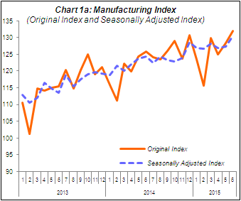 Year-on-year, Manufacturing sector output edged up to 4.9% in June 2015 after an increase of 3.2% registered in May 2015. The major sub-sectors showed an increase in June 2015 were: Electrical and Electronics Products (6.1%); Food, Beverages and Tobacco (11.2%) and Petroleum, Chemical, Rubber and Plastic Products (2.2%). On a seasonally adjusted month-on-month basis, Manufacturing output  grew by 2.5% in June 2015.