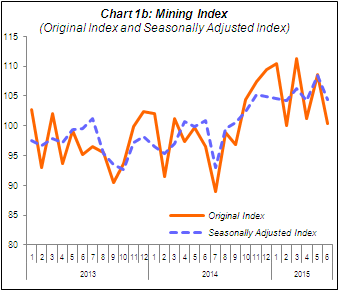 The Mining sector output increased by 4.0% in June 2015 compared to the same month in 2014. This expansion was mainly due to the increase of Crude Oil index (6.6%) and Natural Gas index (1.0%). As against May 2015, seasonally adjusted output for the Mining sector declined by 3.7%.