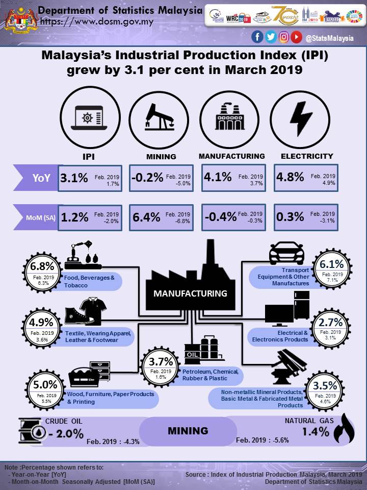 Malaysia’s Industrial Production Index (IPI) grew by 3.1 per cent in March 2019