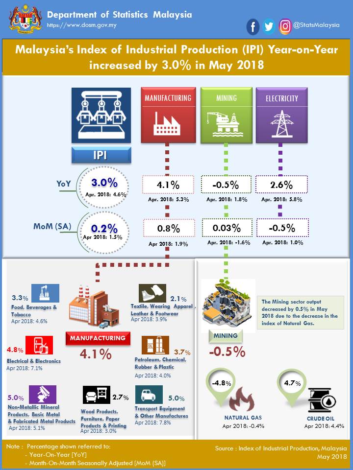 Malaysia’s Industrial Production Index (IPI) increased by 3.0 per cent in May 2018