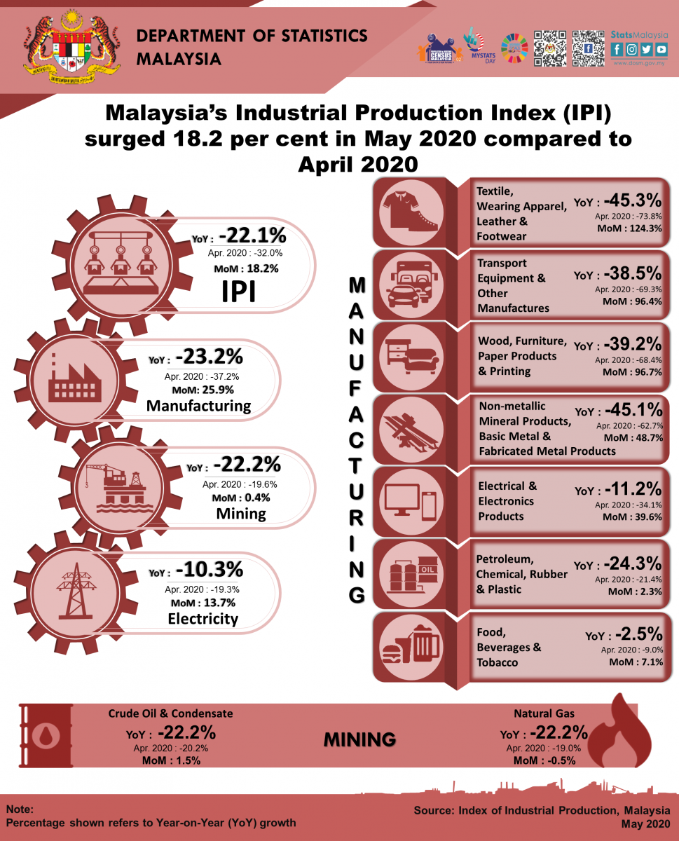 Malaysia’s Industrial Production Index (IPI) surged 18.2 per cent in May 2020 compared to April 2020