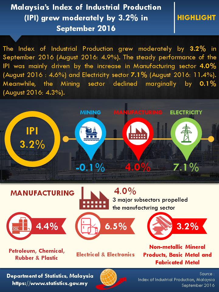 Malaysia’s Index of Industrial Production (IPI) grew moderately by 3.2% in September 2016