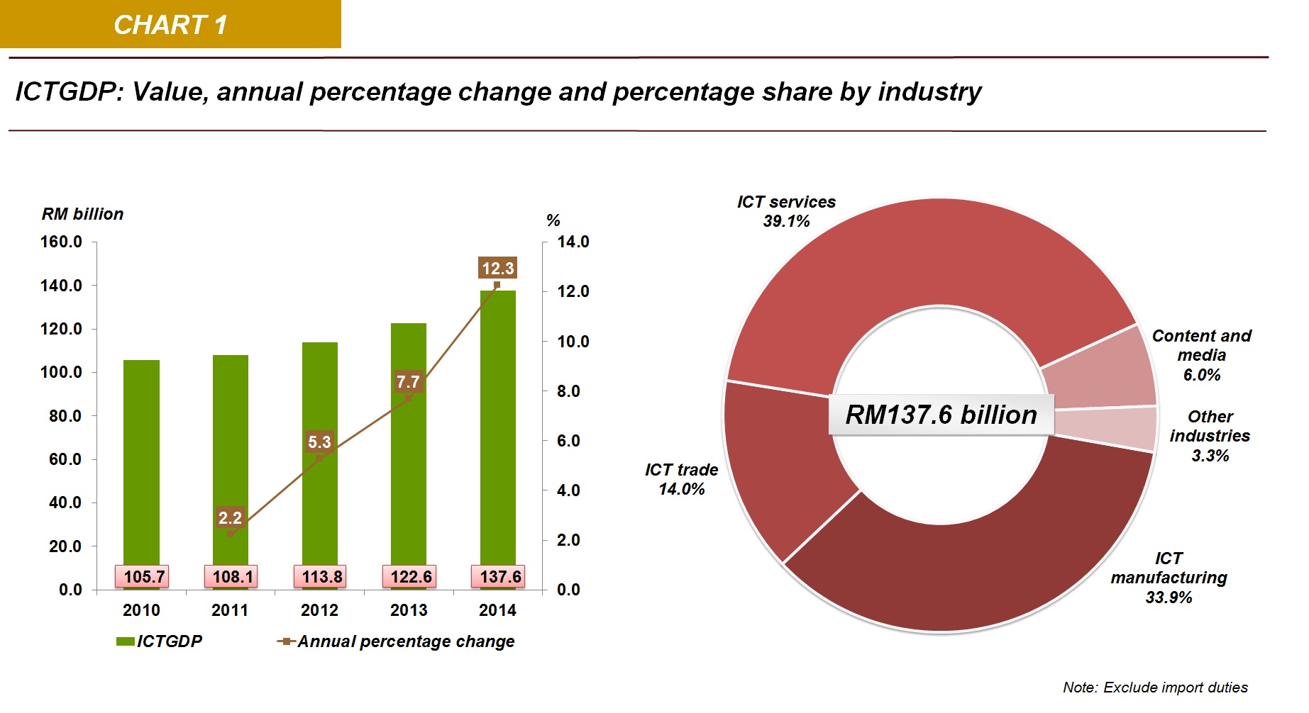 In 2014, ICTGDP recorded a value of RM137.6 billion (2013: RM122.6 billion). ICTGDP registered a double-digit growth of 12.3 per cent (2013: 7.7%), driven by activities in the ICT manufacturing and ICT services. ICT services dominated the ICTGDP with a share of 39.1 per cent while ICT manufacturing advanced further to 33.9 per cent (2013: 32.8%) as shown in Chart 1.