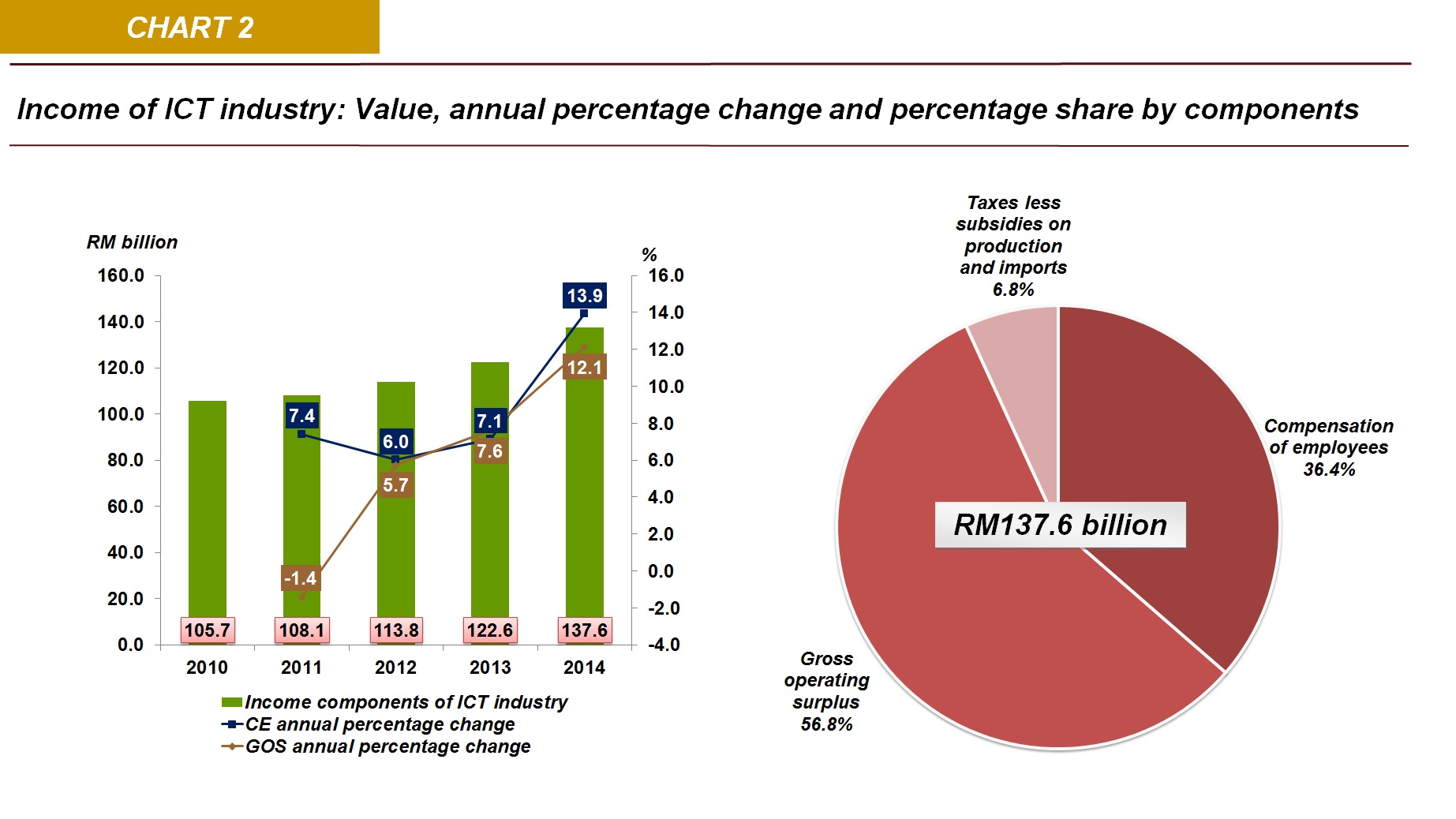 Income of ICT industry expanded to RM137.6 billion in 2014 (2013: RM122.6 billion). The compensation of employees in ICT industry recorded a value of RM50.1 billion with a share of 36.4 per cent to total income of ICT (Chart 2). In terms of growth, the compensation of employees accelerated to 13.9 per cent supported by ICT manufacturing and ICT services.