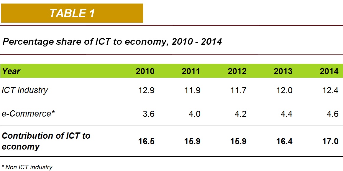 The share of ICT to the economy augmented to 17.0 per cent in 2014. ICTGDP contributed 12.4 per cent while e-Commerce was 4.6 per cent (Table 1).