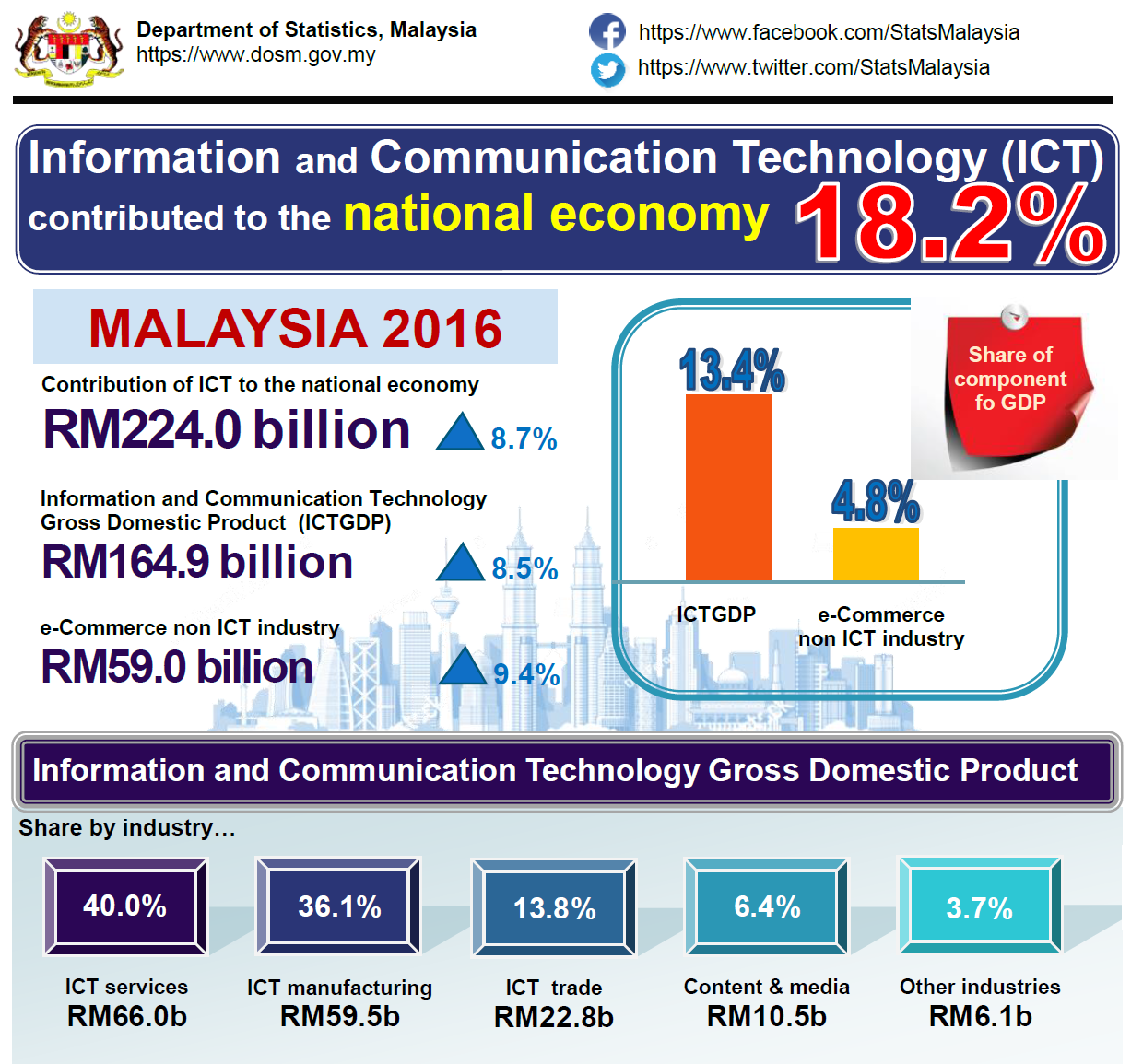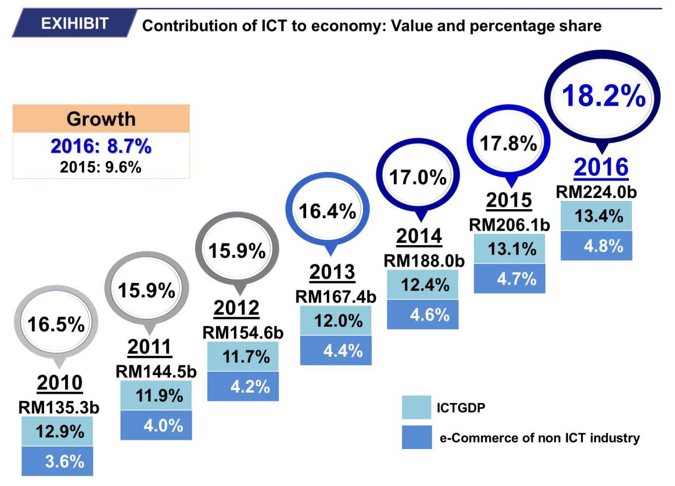 Contribution of ICT to the national economy registered 18.2 per cent (RM224.0 billion) in 2016. ICTGDP accounted for 13.4 per cent while e-Commerce for non ICT industries registered 4.8 per cent as shown in Exhibit.