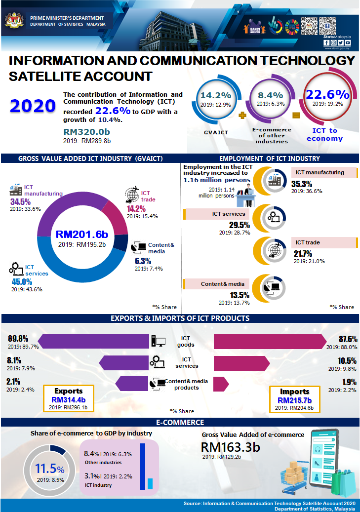 Contribution of Information and Communication Technology (ICT) to economy continued to expand at RM320.0 billion in 2020, registered a double-digit growth of 10.4 per cent compared to 7.3 per cent in the previous year. ICT contributed 22.6 per cent to Gross Domestic Product (GDP), comprises of Gross Value Added of ICT industry (GVAICT), 14.2 per cent and e-commerce of other industries, 8.4 per cent.