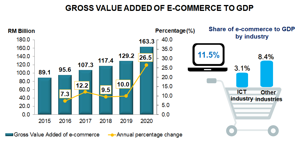 Gross Value Added of e-commerce increased to RM163.3 billion from RM129.2 billion in 2020, surged 26.5 per cent (2019: 10.0%). The growth was supported by ICT trade and ICT services. In terms of share to GDP, e-commerce of ICT industry contributed 3.1 per cent while e-commerce for other industries was 8.4 per cent.