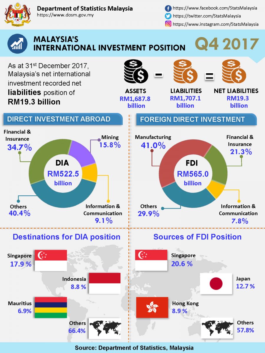 Malaysia's net international investment position at the end of December 2017 recorded net liabilities of RM19.3 billion (Q3 2017: net asset position RM21.5 billion). Total financial assets position recorded RM1,687.8 billion and total liabilities registered RM1,707.1 billion. At the end of fourth quarter 2017, Direct Investment Abroad (DIA) position recorded RM522.5 billion (Q3 2017: RM554.0 billion) and Foreign Direct Investment (FDI) position in Malaysia accounted for RM565.0 billion (Q3 2017: RM558.7 billion).