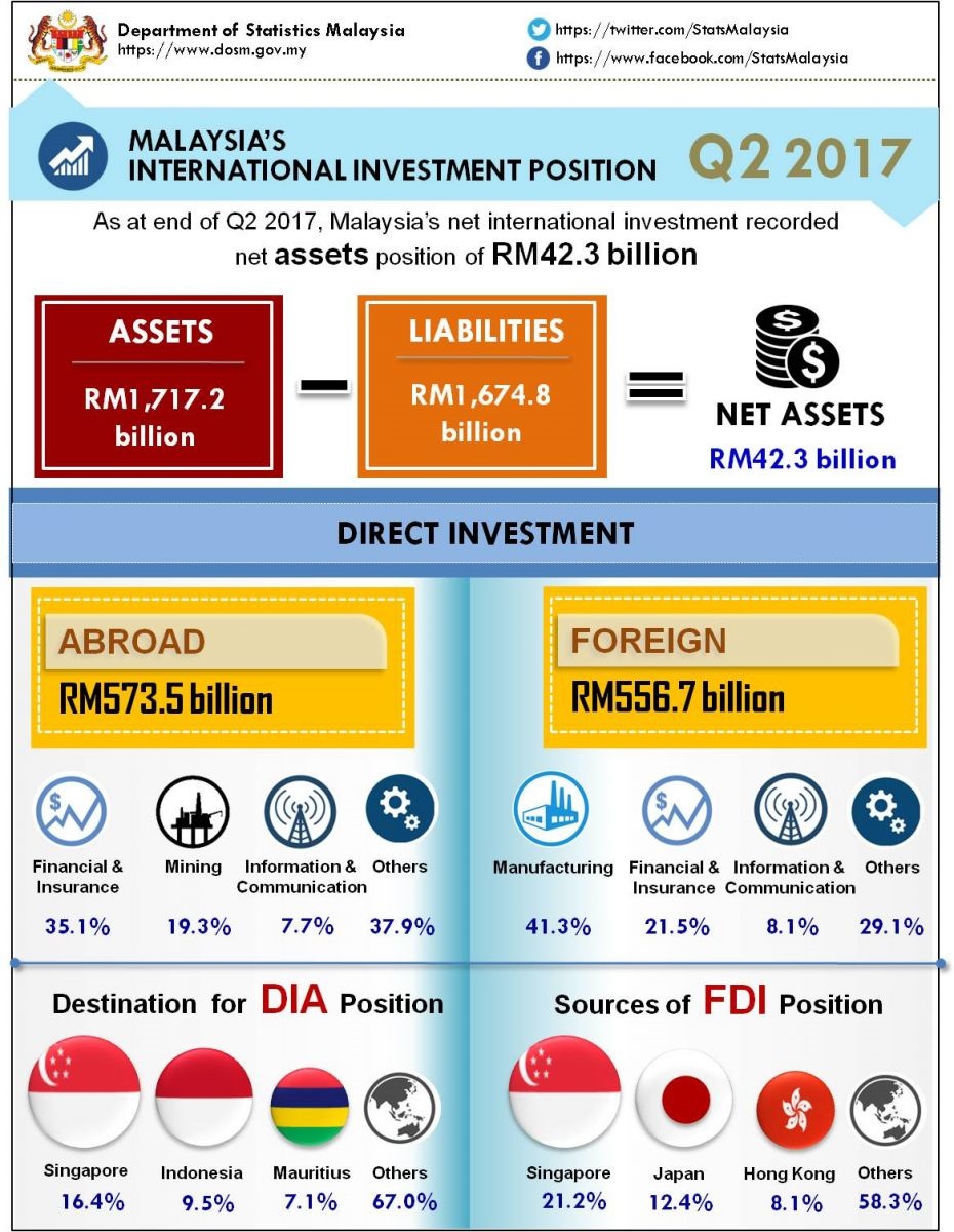 Malaysia’s net international investment recorded net assets position of RM42.3 billion at the end of second quarter 2017. The total financial assets position narrowed by 1.3 per cent to RM1,717.2 billion (Q1 2017: RM1,739.4 billion), while the total liabilities decreased by RM1.6 billion to RM1,674.8 billion (Q1 2017: RM1,676.4 billion). Direct Investment Abroad (DIA) position recorded RM573.5 billion at the end of Q2 2017 (Q1 2017: RM568.4 billion) and Foreign Direct Investment (FDI) in Malaysia registered a value of RM556.7 billion (Q1 2017: RM560.9 billion).