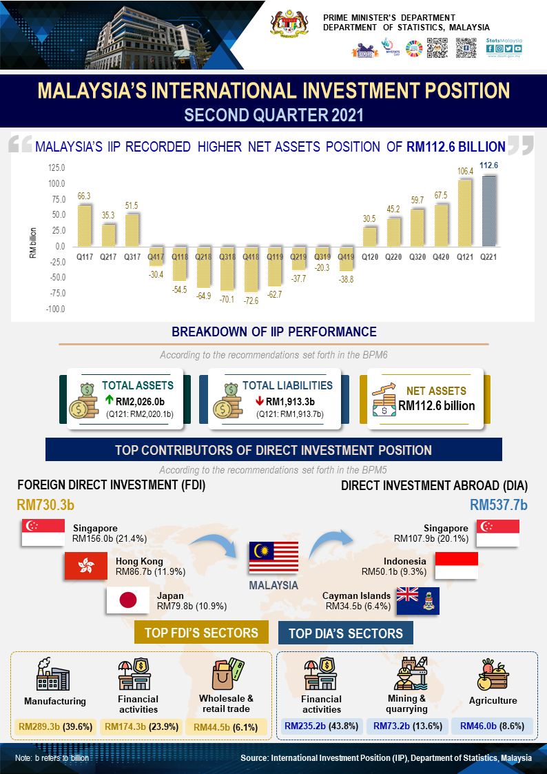 Malaysia’s International Investment Position (IIP) posted higher net assets position of RM112.6 billion as against RM106.4 billion in the last quarter, driven by an increase of RM5.9 billion in total financial assets to record RM2,026.0 billion. Meanwhile, total liabilities posted a value of RM1,913.3 billion, slightly decreased from RM1,913.7 billion in Q1 2021.