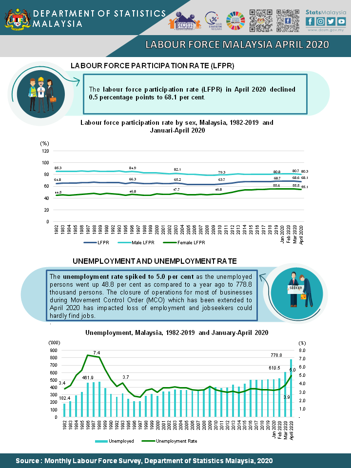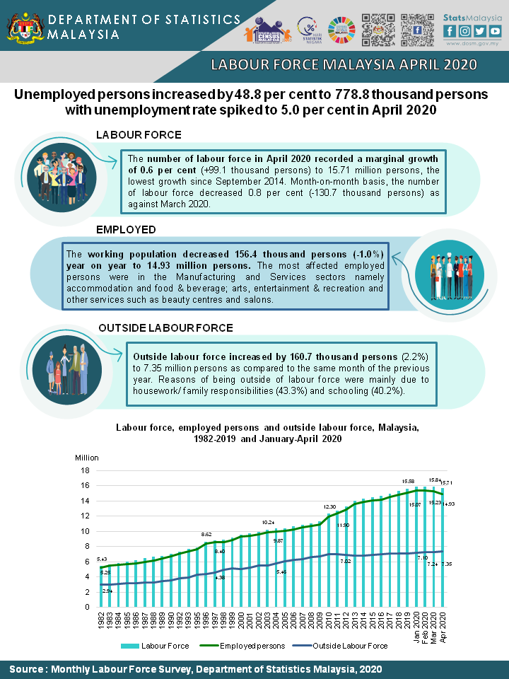 The unemployment rate spiked to 5.0 per cent as the unemployed persons went up 48.8 per cent as compared to a year ago to 778.8 thousand persons. The closure of operations for most of businesses during Movement Control Order (MCO) which has been extended to April 2020 has impacted loss of employment and jobseekers could hardly find jobs.
